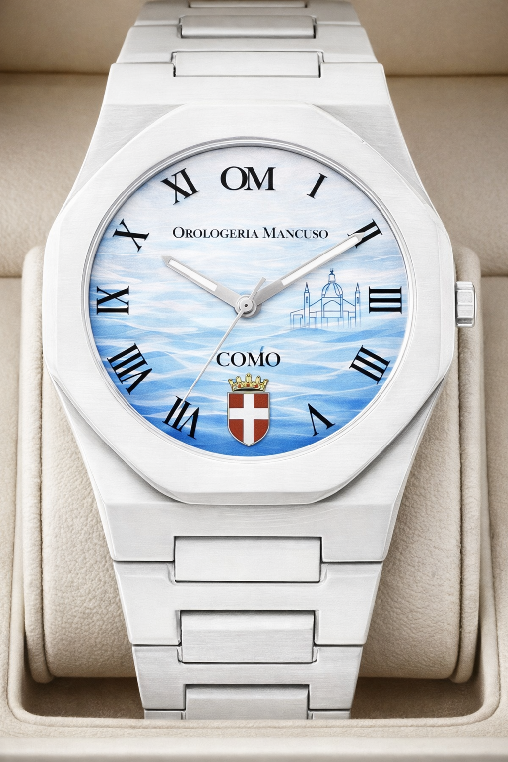 Il quadrante, ispirato alle onde del Lago di Como, dona profondità e movimento, mentre i simboli della città aggiungono un tocco distintivo e riconoscibile.